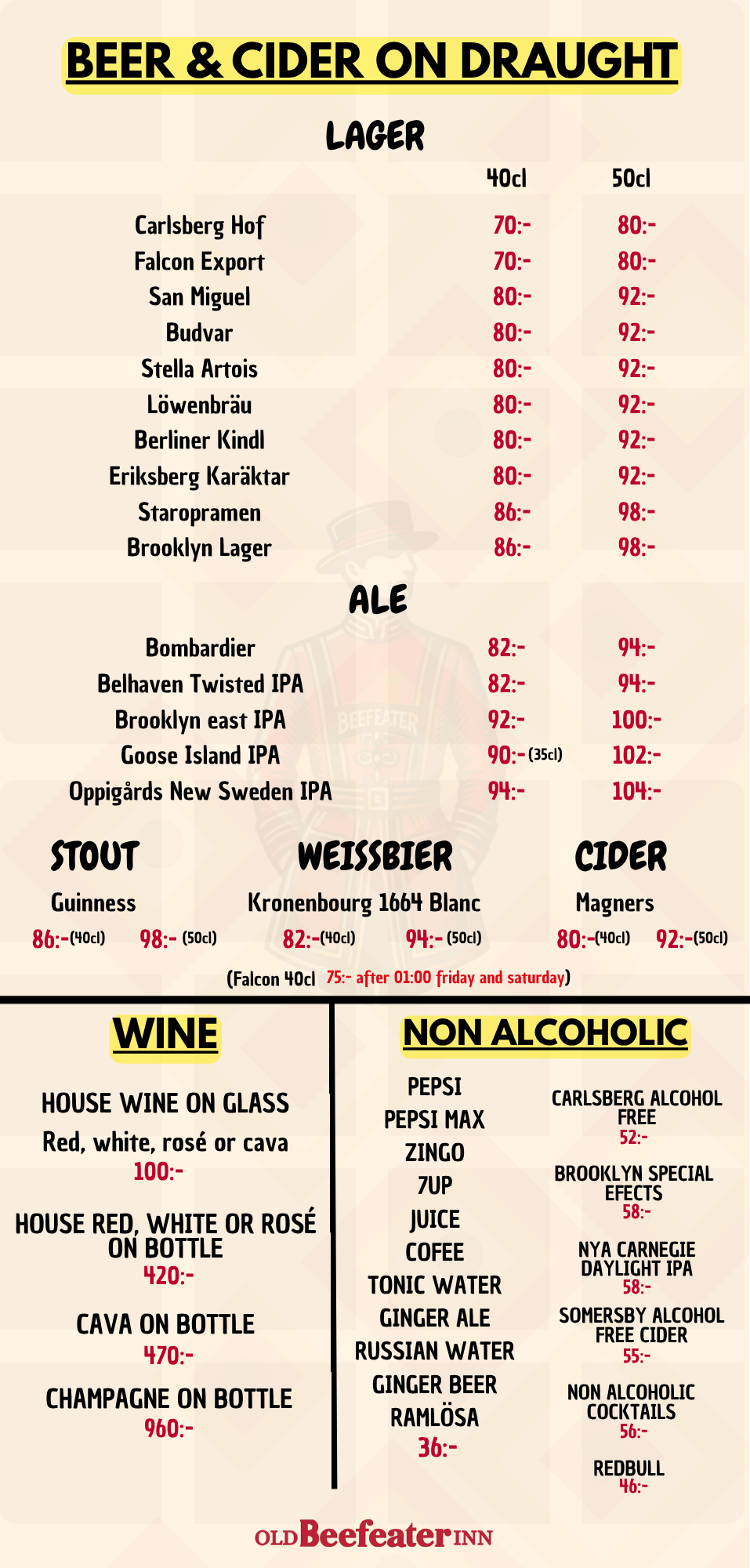 Hos oss äter man klassisk pubmat och grillat. Välj mellan en massa godsaker från menyn. Självklart har vi dryck som passar till maten och även en härlig barmeny för den som är lite sugen.